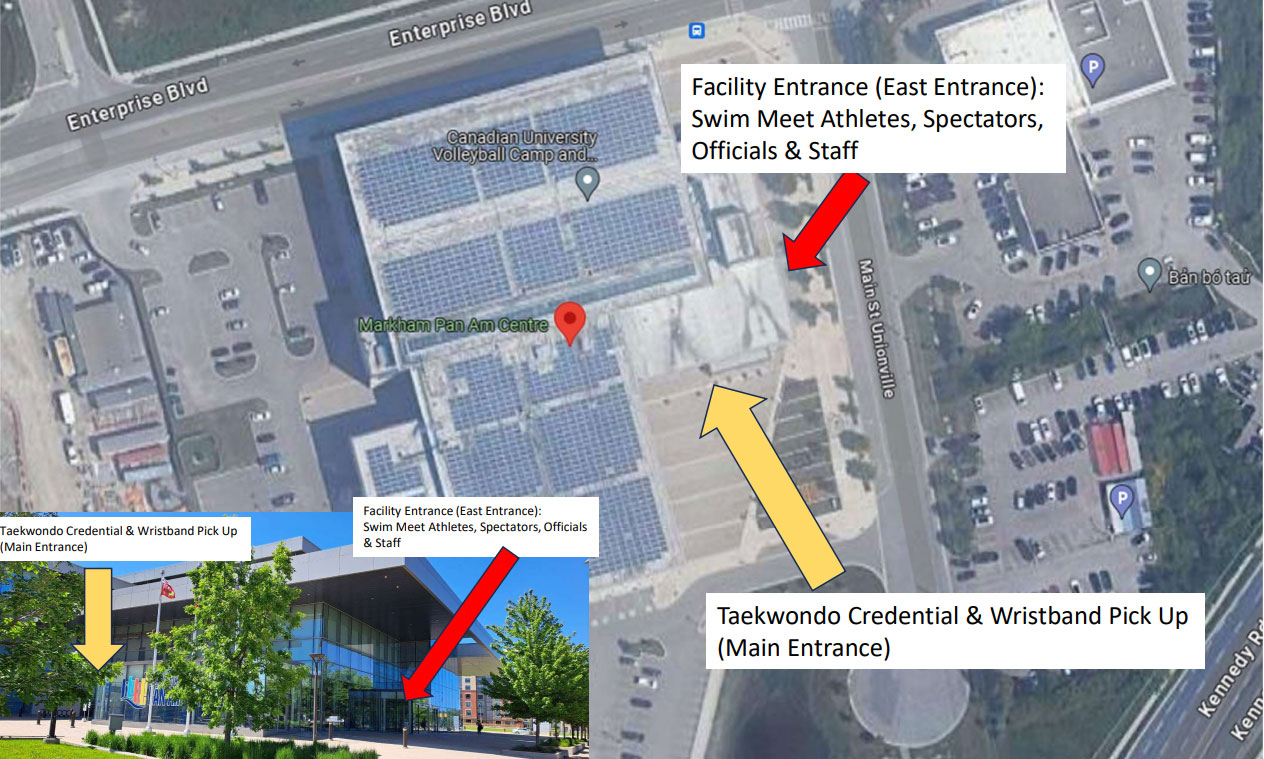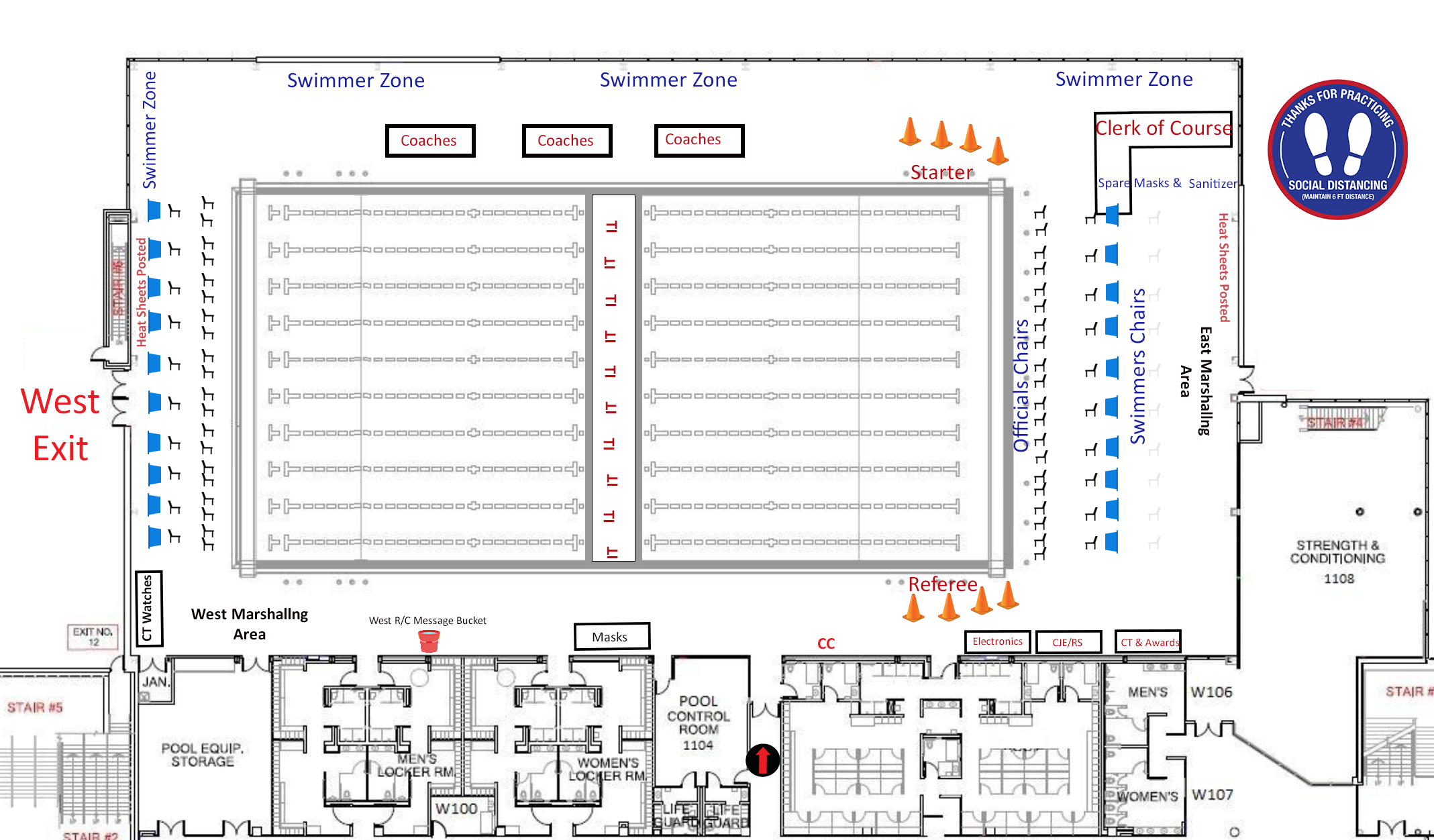 Everyone associated with the Swim Meet will used the EAST sliding doors and proceed immediately upstairs for spectators or down the main hallway for athletes, officials, coaches. Signage outside the venue will be posted. Below is an image showing which doors that you may also share.